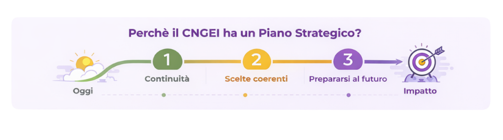 Il CNGEI ha un Piano Strategico per garantire una direzione chiara e condivisa nel tempo, assicurando continuità strategica alle scelte dell’associazione. Il Piano Strategico orienta le nostre decisioni educative, formative e organizzative dei prossimi anni, permettendo di dare coerenza alle azioni e di rafforzarne l’impatto. Allo stesso tempo, permette di osservare i cambiamenti in atto, anticiparli e prepararsi in modo consapevole alle sfide future, così da arrivare pronti al mondo di domani.